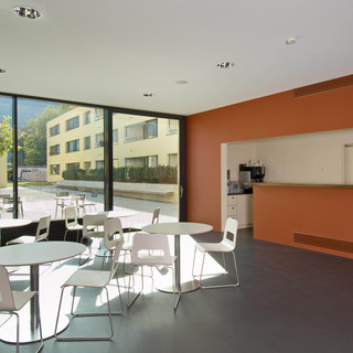 _Beschäftigung: mit Caféteria, Essraum und Mehrzweckhalle. Im Weiteren hat es eine Grossküche mit Essensausgabe sowie eine Wäscherei. Im 1. + 2. Obergeschoss befinden sich Beschäftigungs-Ateliers / Liegeräume / Garderoben sowie Lagerräume. Zudem befinden sich im 2. Obergeschoss Reserveräume. Die Halle ist gegen die Strasse und den Innenhof verglast.